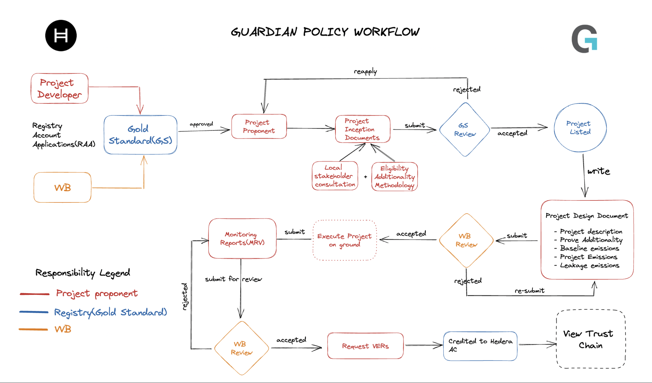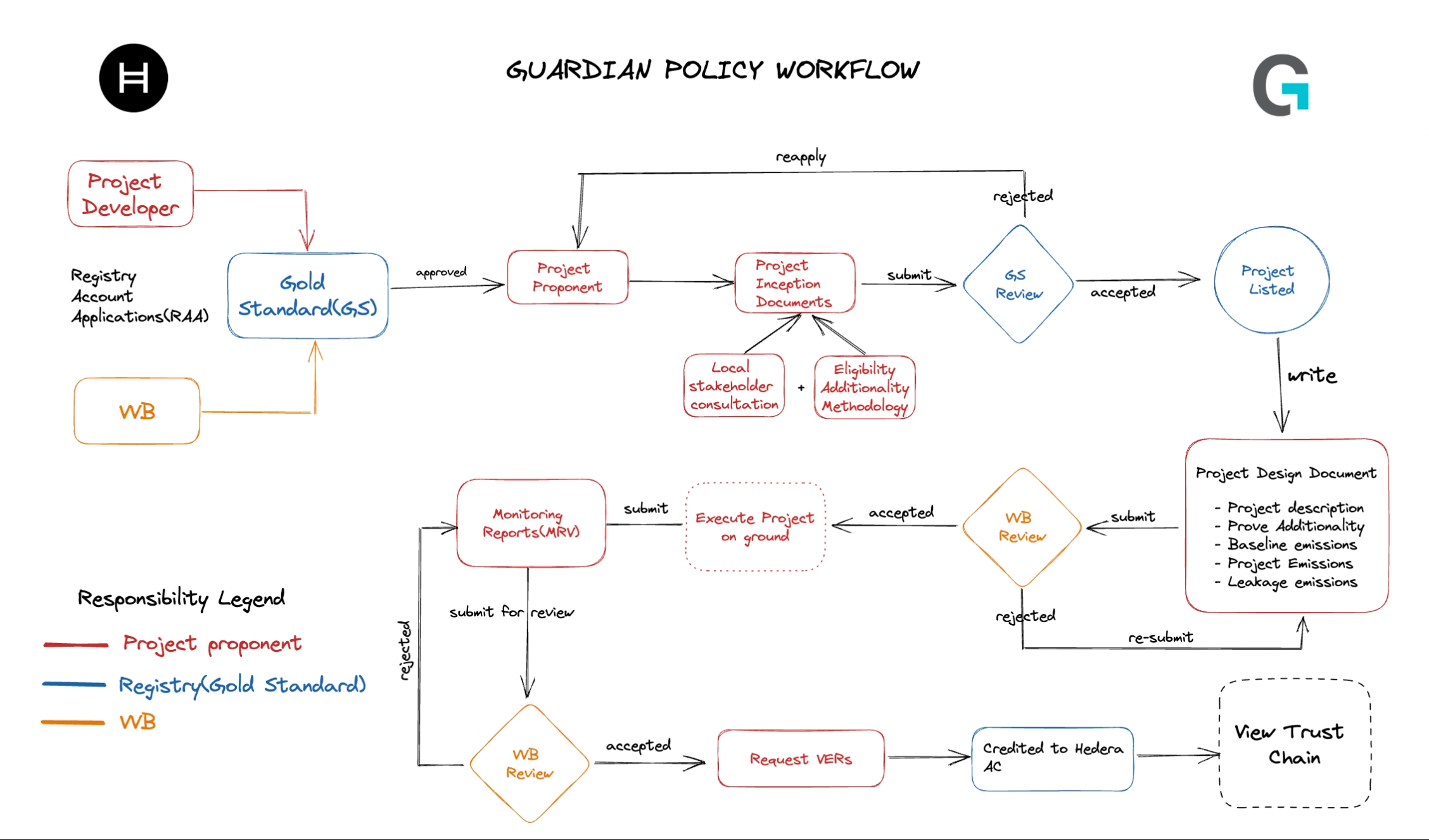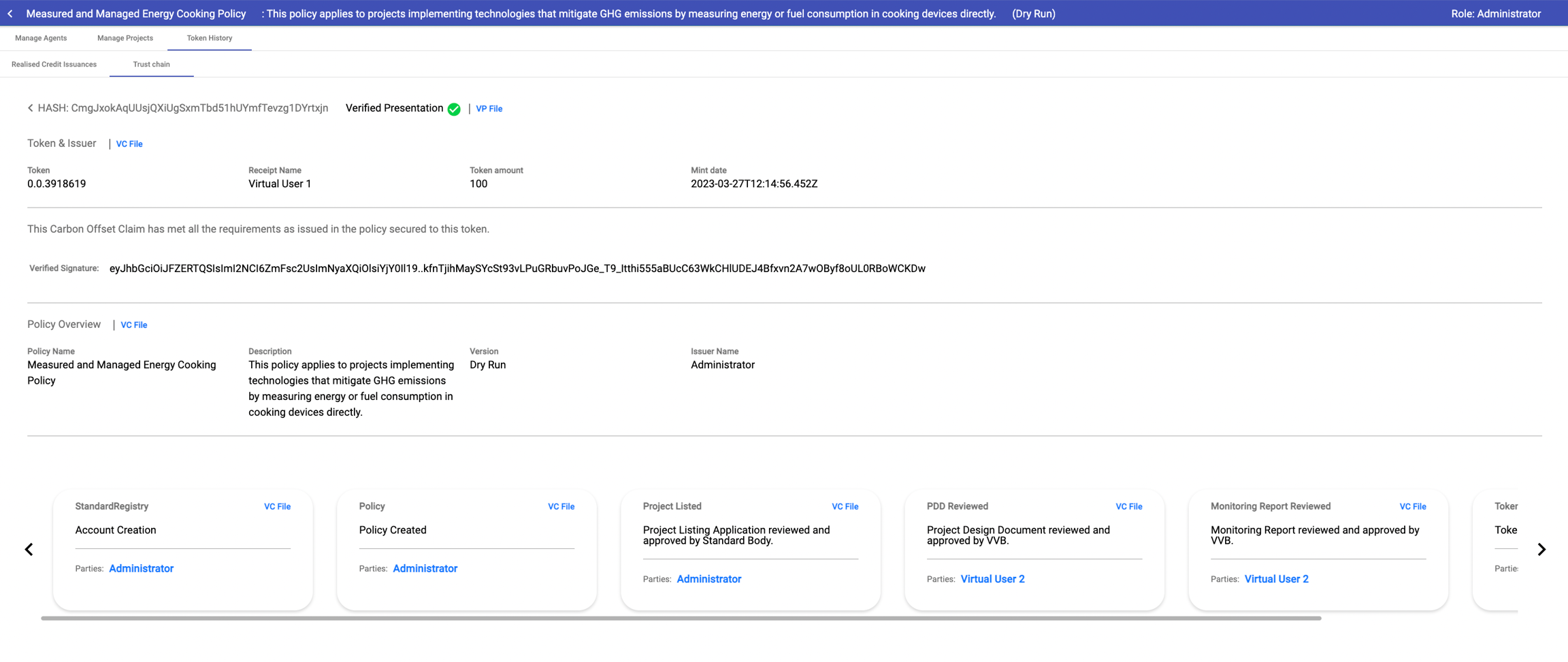 Once VER issue request is approved, an end-to-end trust chain can be viewed by administrator. Since everything is happening transparently on public ledger(Hedera), anyone can trace the source of credits and each step that happened in the process.