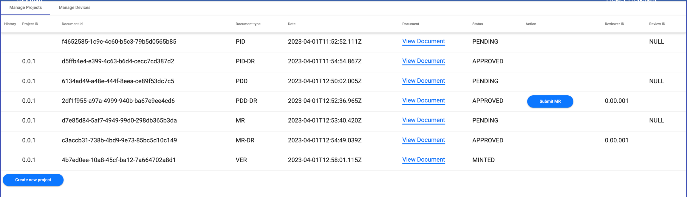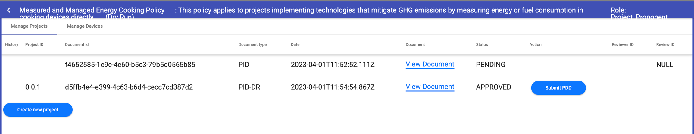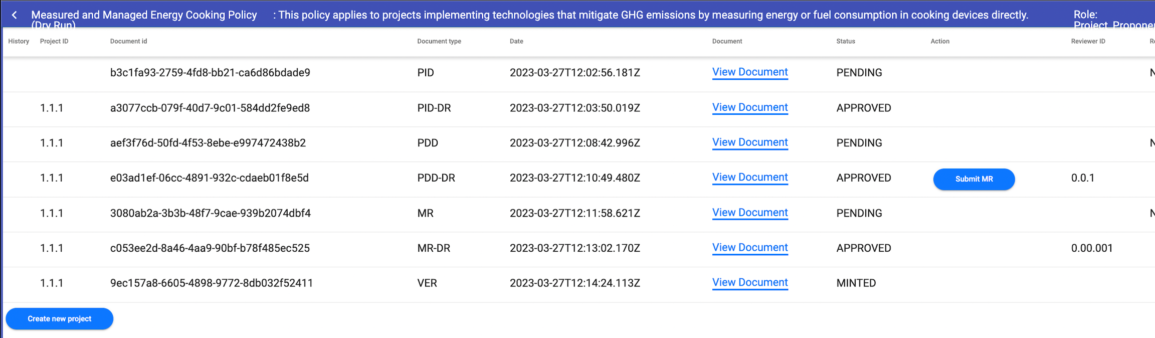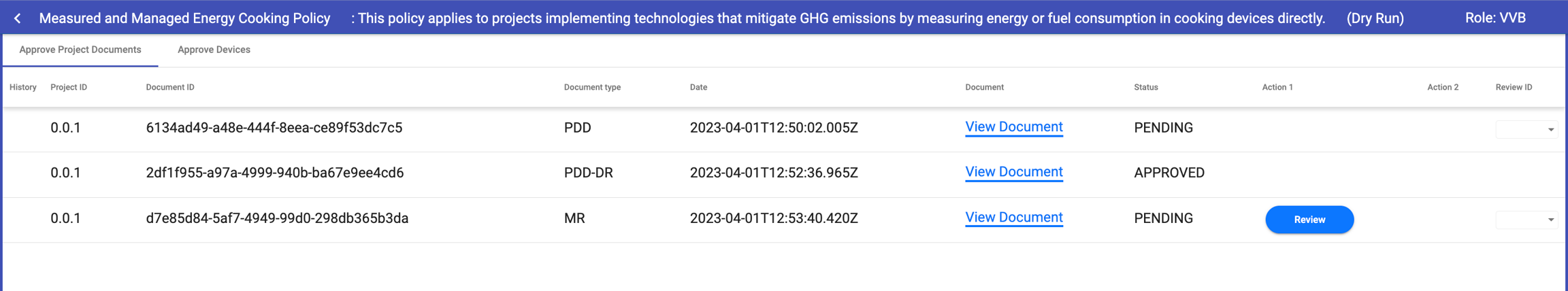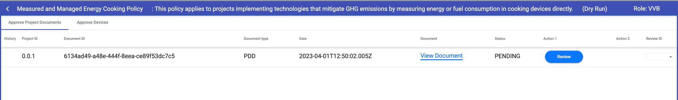 After logging in as VVB, they can view review requests related to project documents. First step is to review PDDs submitted by project proponents.