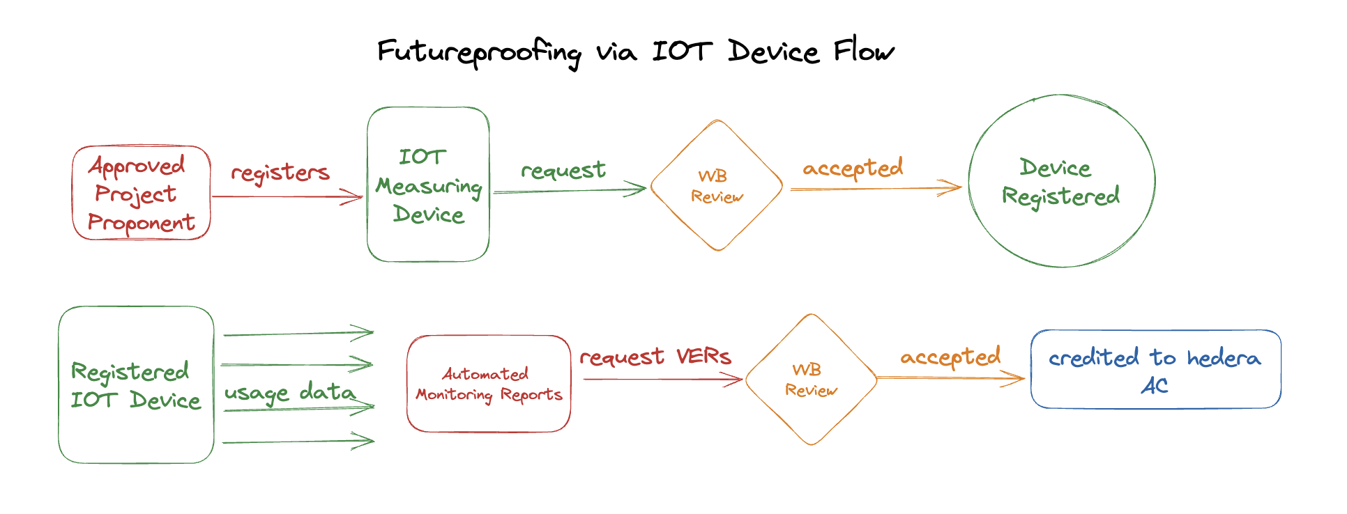 This workflow includes a bonus flow which is a major distinction from other existing policies. Building monitoring reports for cookstove projects is a very manual and error-prone process due to distributed nature of project. Often, a sample group of households are selected to be monitored and results are extrapolated for all the households(in thousands) leading to overcrediting. Since this methodology focuses on having direct measurement devices associated with a stove, an automated way of monitoring is possible.