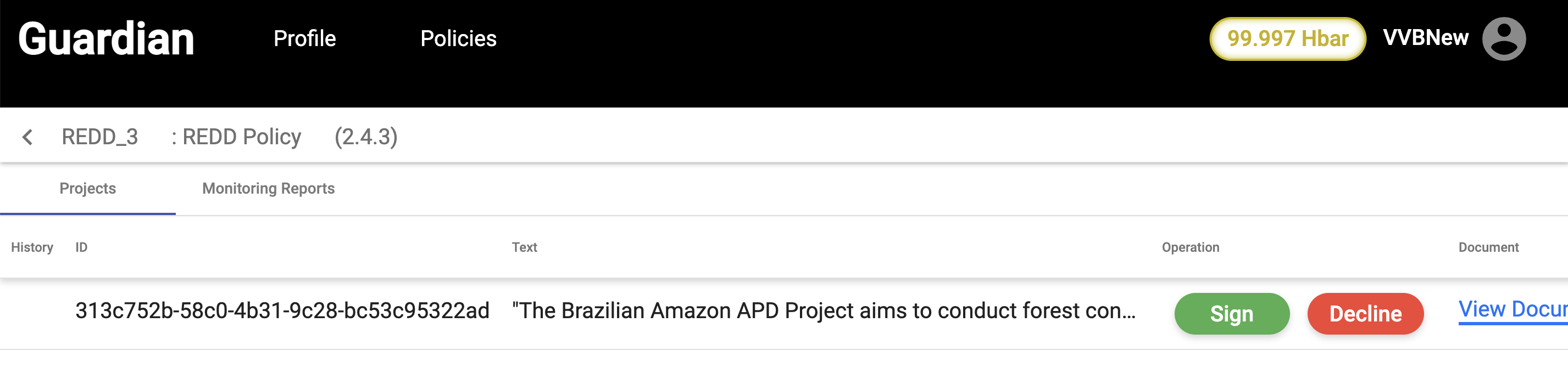 Now, you log out and log in to VVBNew. You will be able to view the Verifiable Credential by selecting the View Document button. Once, you are ready to verify the monitoring report details, you can click on the Sign button.