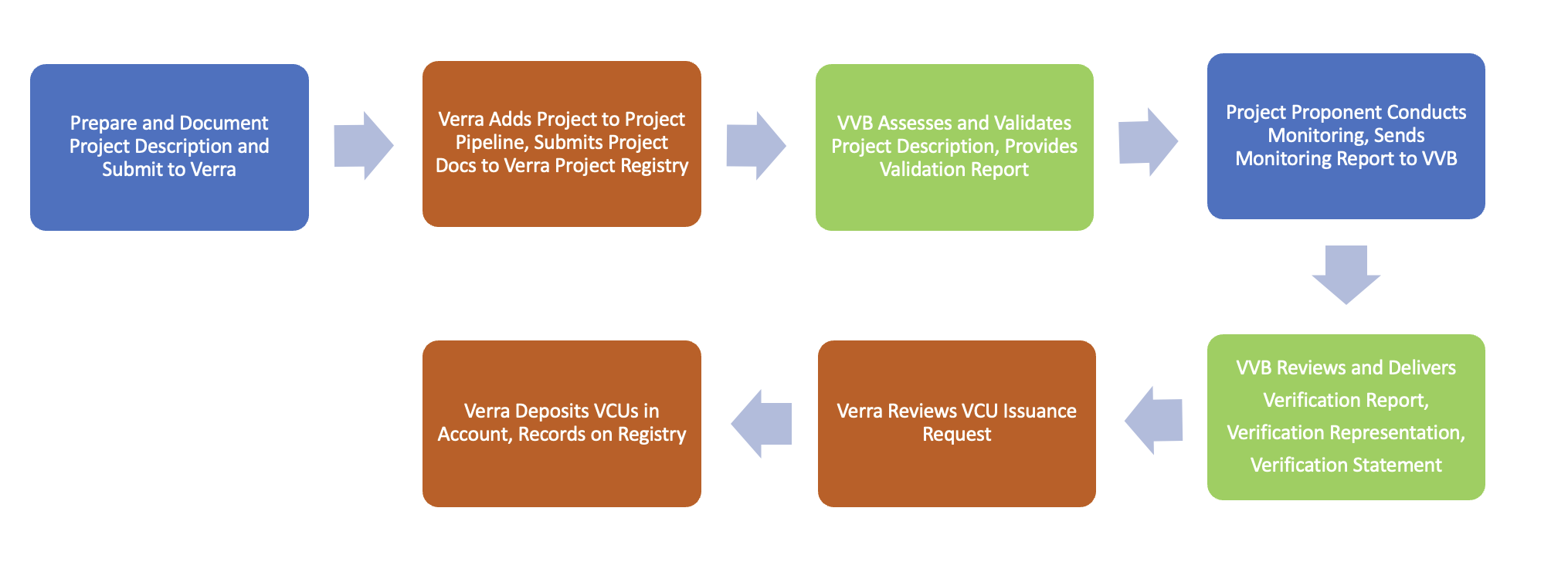 The workflow begins with the Project Proponent submitting the project description (PD) to Verra. The project description will include ex-ante estimates of the monitoring parameters, as well as other project details to demonstrate alignment with the VCS program requirements. Verra then adds the PD and project docs to the Project Pipeline and Project Registry. Next, the Validation and Verification Body (VVB) will assess and validate the PD and provide a Validation Report. Then the Project Proponent will conduct monitoring and develop a Monitoring Report, replacing the ex-ante estimates with ex-post MRV data and submitting it to the VVB. The VVB then verifies the Monitoring Report and delivers a Verification Report, Verification Representation, and Verification Statement. Finally, Verra reviews the issuance request, and VCUs are issued to the Project Proponent.