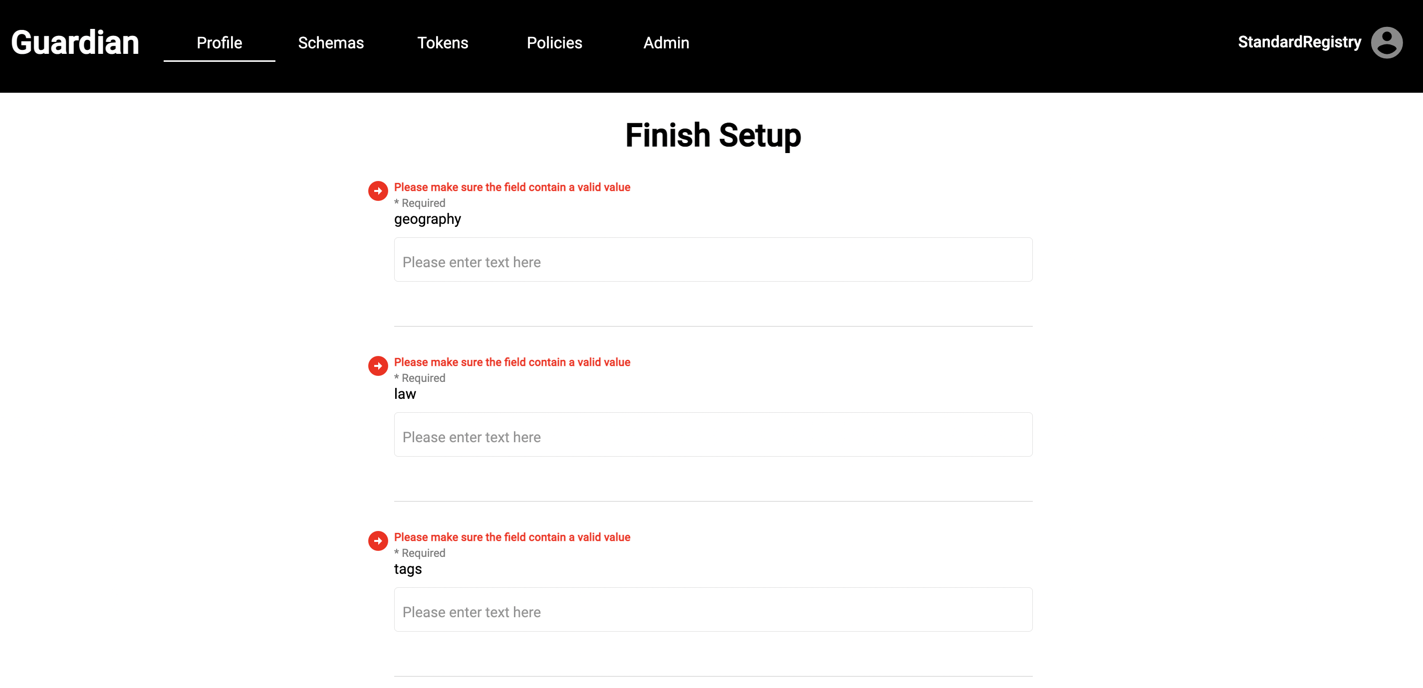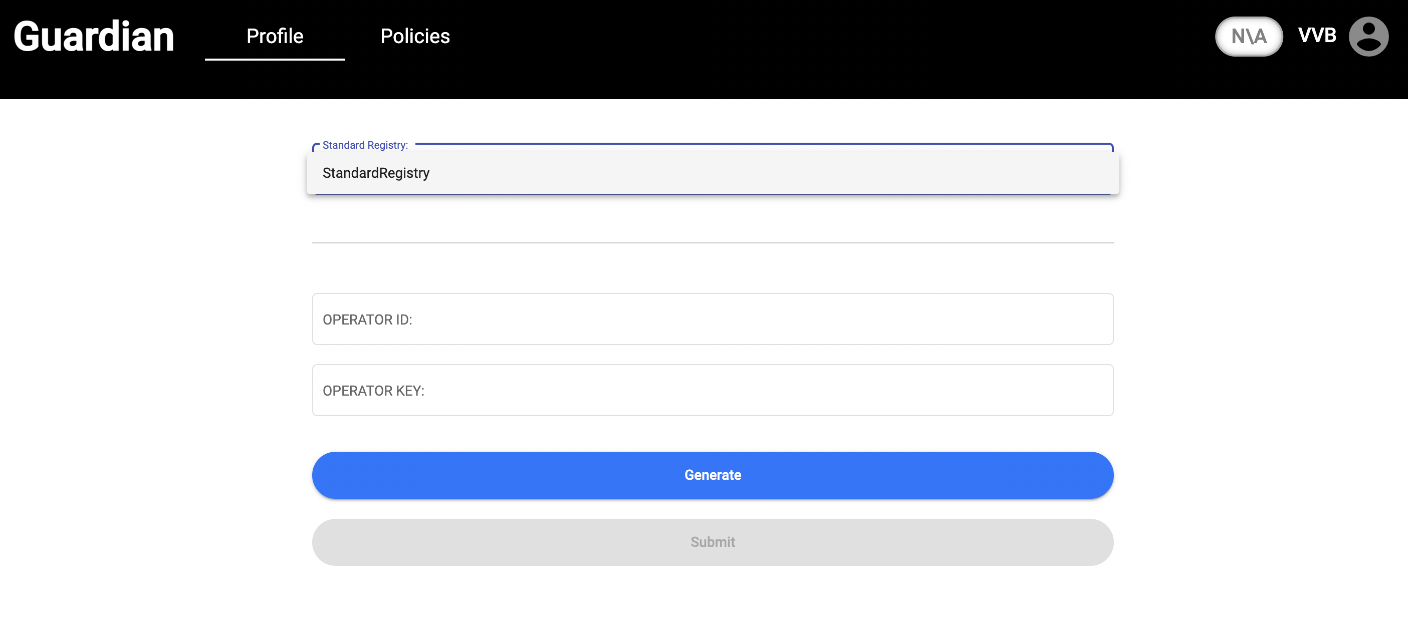Click on the Standard Registry profile icon and select "Log Out." We will create a user called a VVB (Verification and Validation Body). Once that user is created, we can log in and select the Standard Registry we created earlier in the dropdown. Also, generate the Operator ID and Operator Key and press submit.