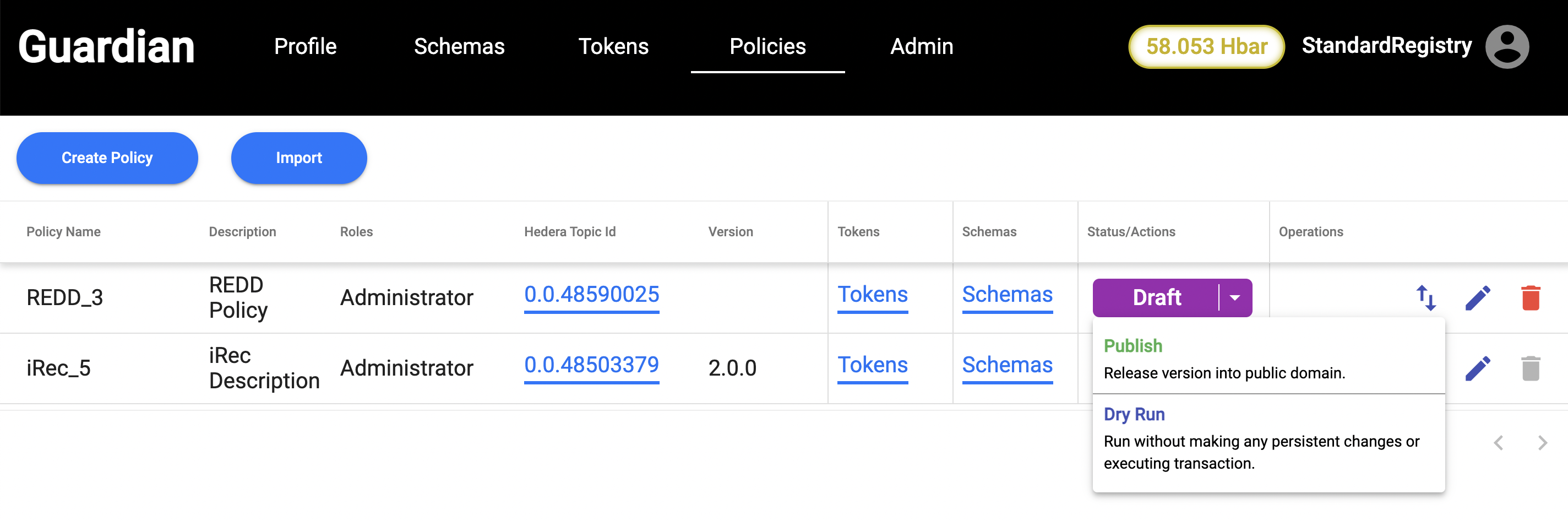 Now we will be creating the Policy. We have three ways to "create policies." The first way is to actually create the policy from scratch. The second way is to import an existing policy. The second way is to import an existing policy. When you import a policy, all schemas and tokens that are required in the policy are automatically populated. To do this, you can use the sample policy that we have already uploaded to IPFS. Click on the import button and Hedera message IDs: