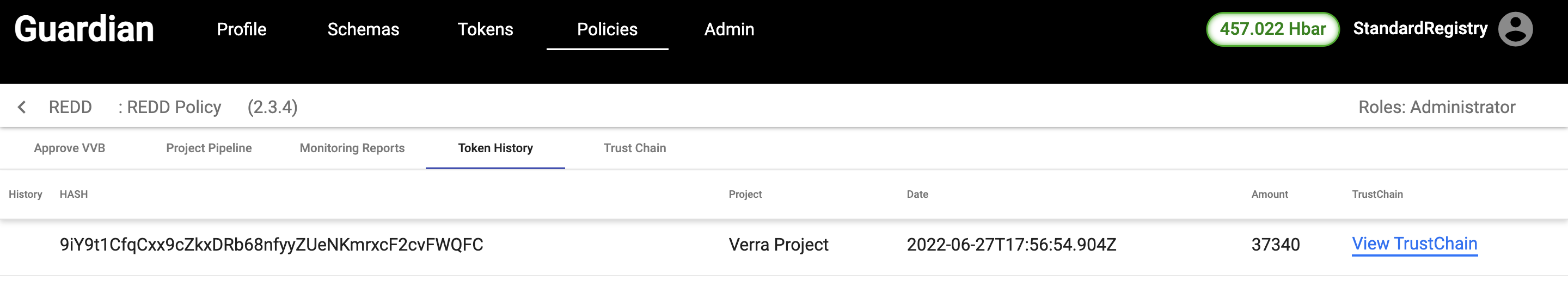 Once the Minting process is completed, navigate to the Token History tab, where you have an option of viewing TrustChain. You can view TrustChain by clicking on the View TrustChain button.