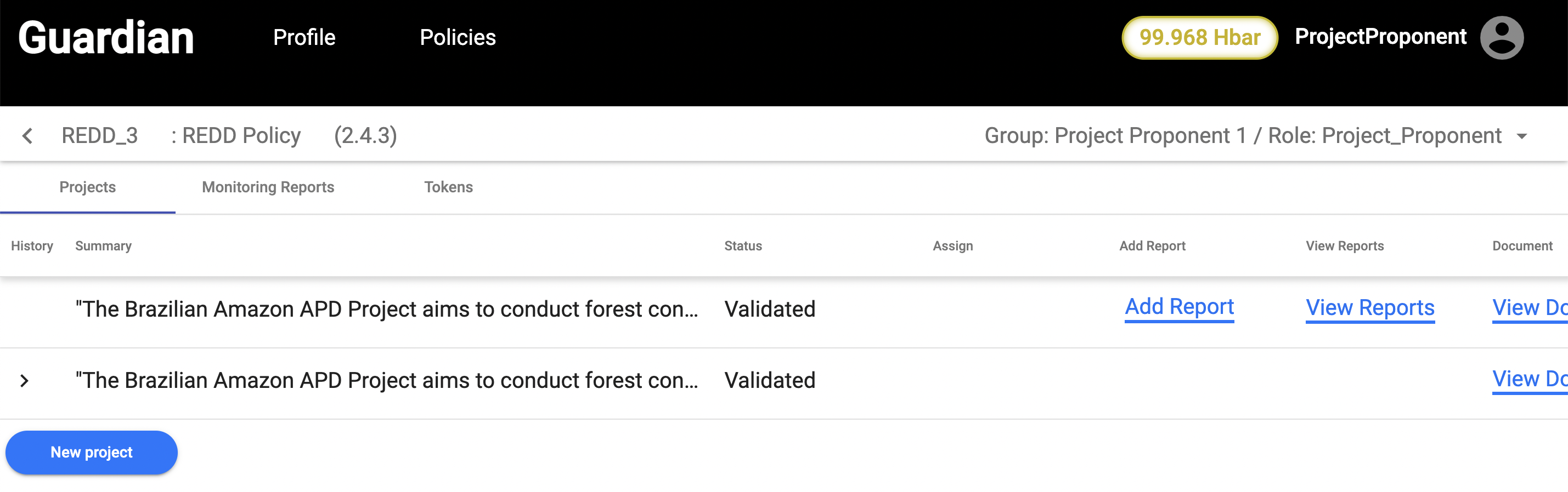 After creating the group, we will see the New Project button. When we click on the button, we get a form, where complete project details need to be added. We have uploaded a [Sample test data](https://github.com/hashgraph/guardian/blob/main/Demo%20Artifacts/REDD%20APD%20Schema%20Design%20Template.xlsx) file in the open-source Guardian repo.