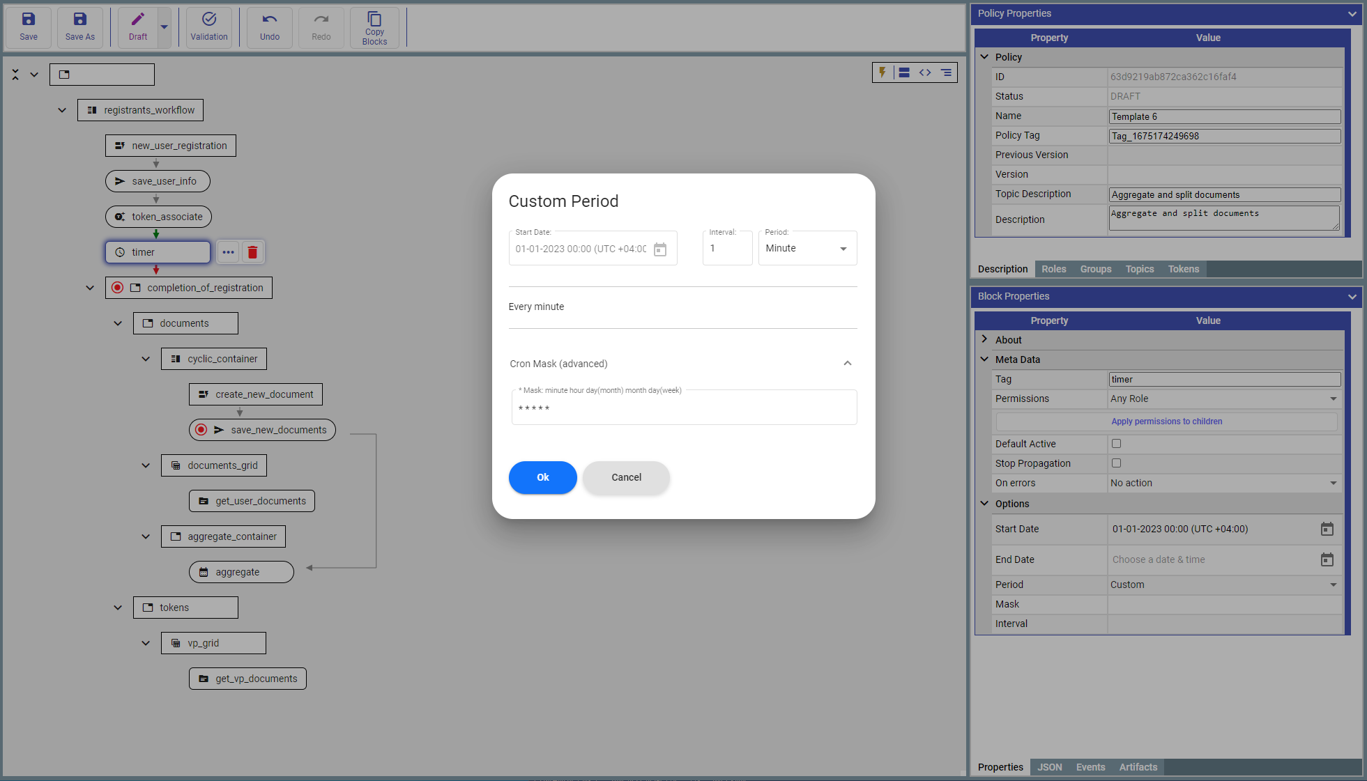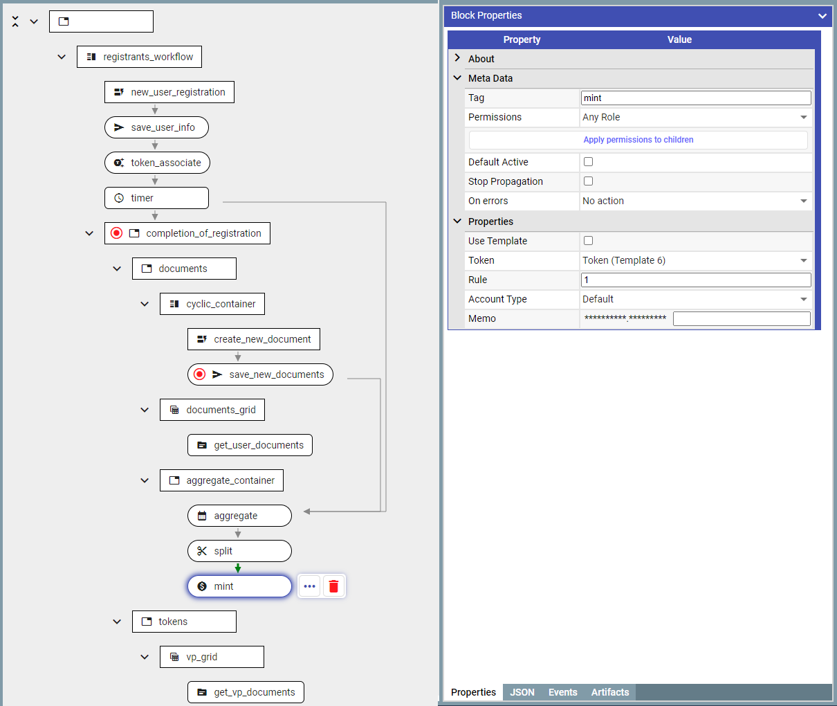 Add '***mintDocumentBlock***' immediately after ‘***splitBlock***' to mint tokes and configure the minting rule
