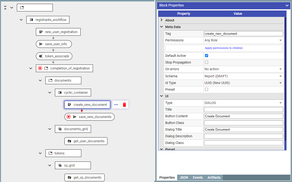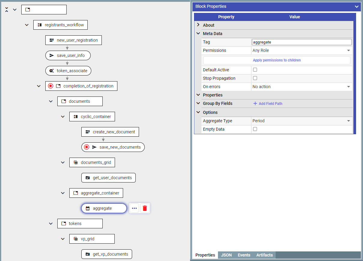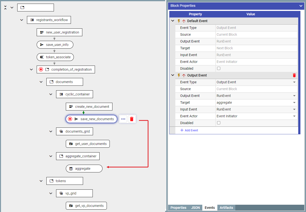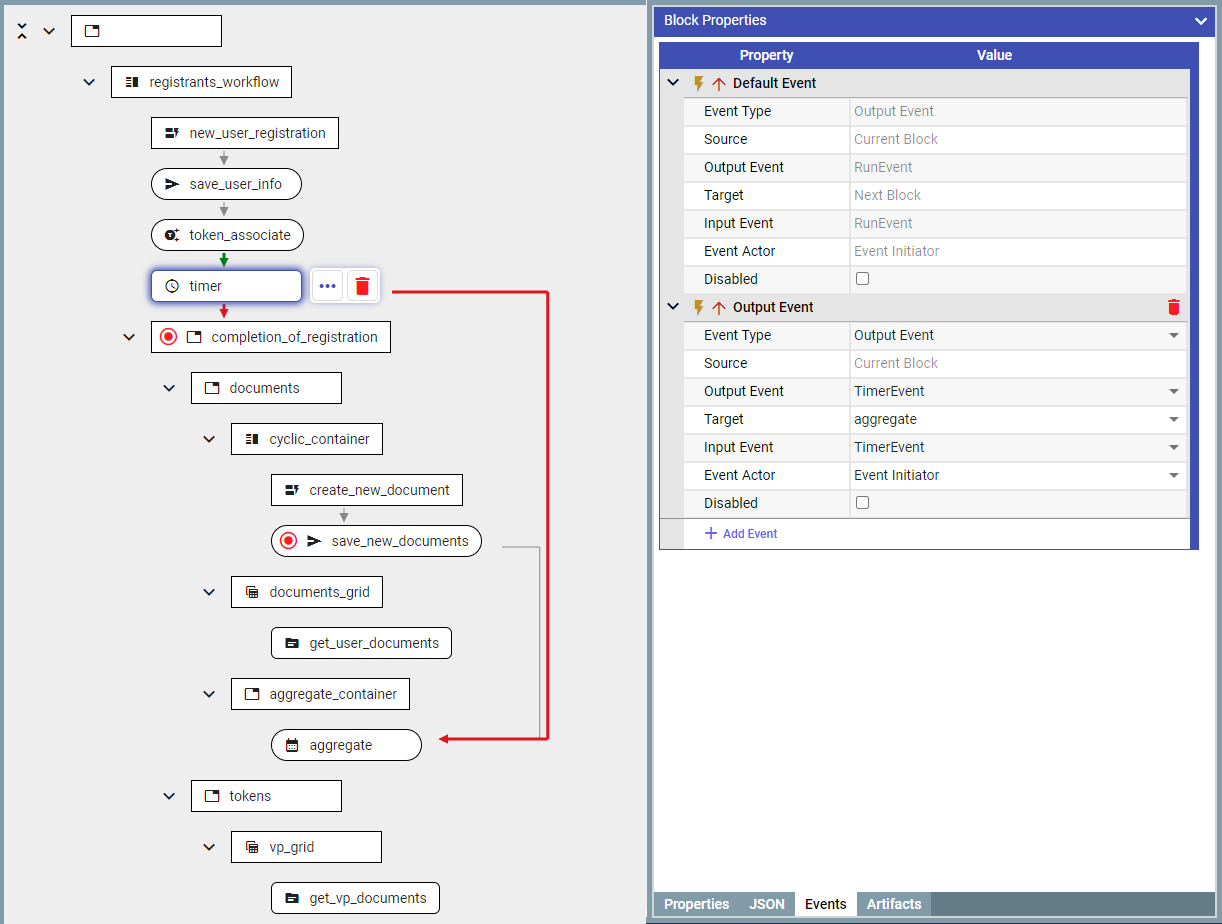 1. Add ‘**aggregateDocumentBlock**' after saving the document in the database. This is the block which would accumulate documents/values until the condition is met (which in this case is the event from the timer).