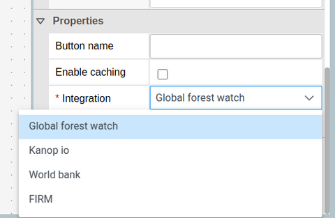| Integration          | <p></p><p>Type of integration. Currently supported values:</p><ul><li>GLOBAL\_FOREST\_WATCH</li><li>KANOP\_IO</li><li>WORLD\_BANK</li><li>FIRM</li></ul>                                                                      | KANOP\_IO         |