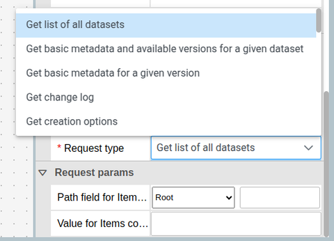 | Request type         | The name of the specific request to execute (varies per integration).                                                                                                                                                         | getDatasets       |
