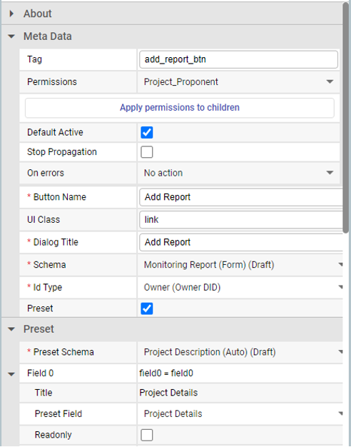| Preset Fields (*presetFields*) | Preset fields configuration.                                     | <p>\[</p><p>{</p><p>"name": "field0",</p><p>"title": "Project Details",</p><p>"value": "field0",</p><p>"readonly": false</p><p>}</p><p>]</p> |        |