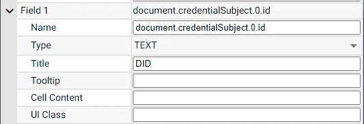 [When Field 1 is shown]: Note that since we are dealing with verifiable credentials, which have a credential subject according to the W3C standard, and since we are dealing with DIDs as identifiers, the credential subject ID is set to be a DID.