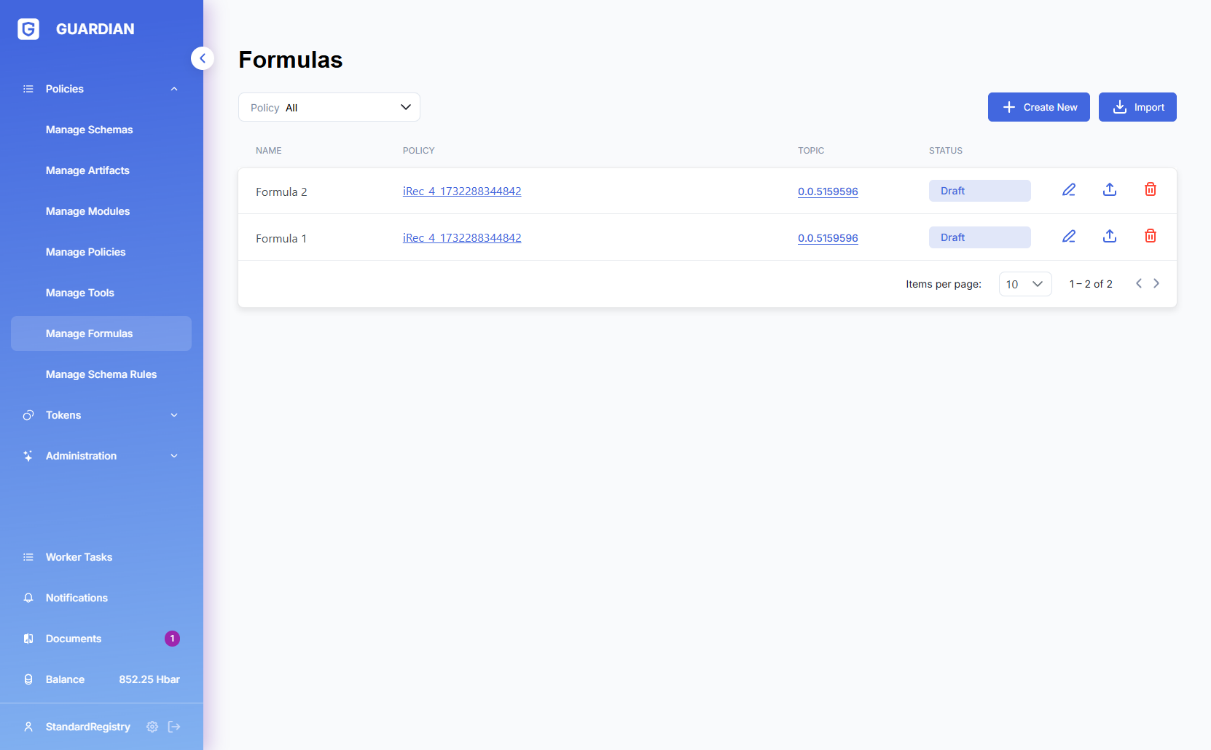 New formula can be created by clicking on the ‘Create New’ button in the corresponding UI form.