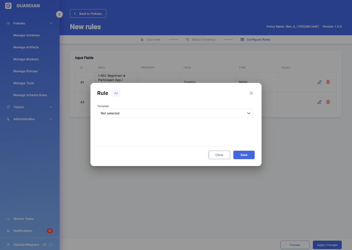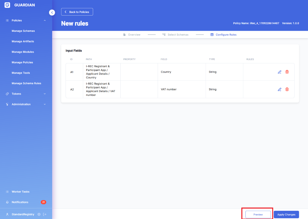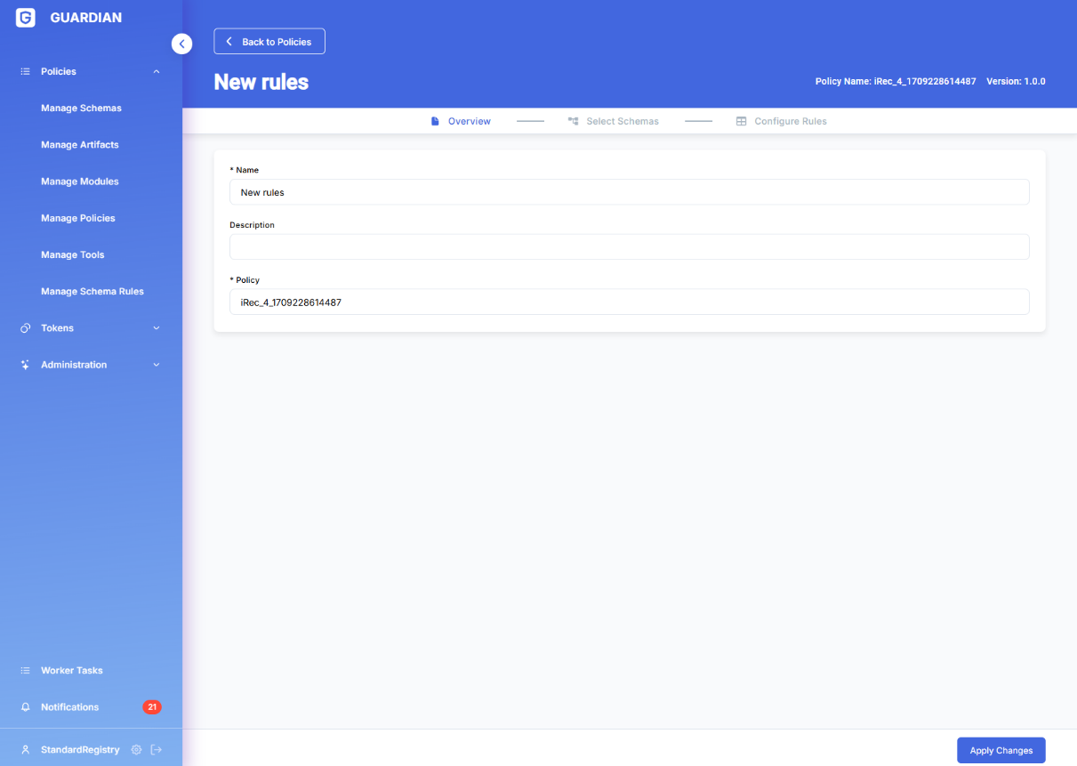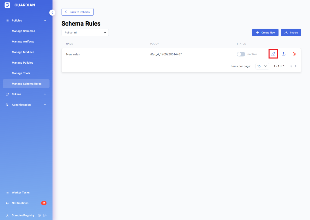 Each Policy can have associated by Schema rules. The list of schema rules is displayed in the corresponding section of the UI, which provides the facility to enable/disable each of them individually.