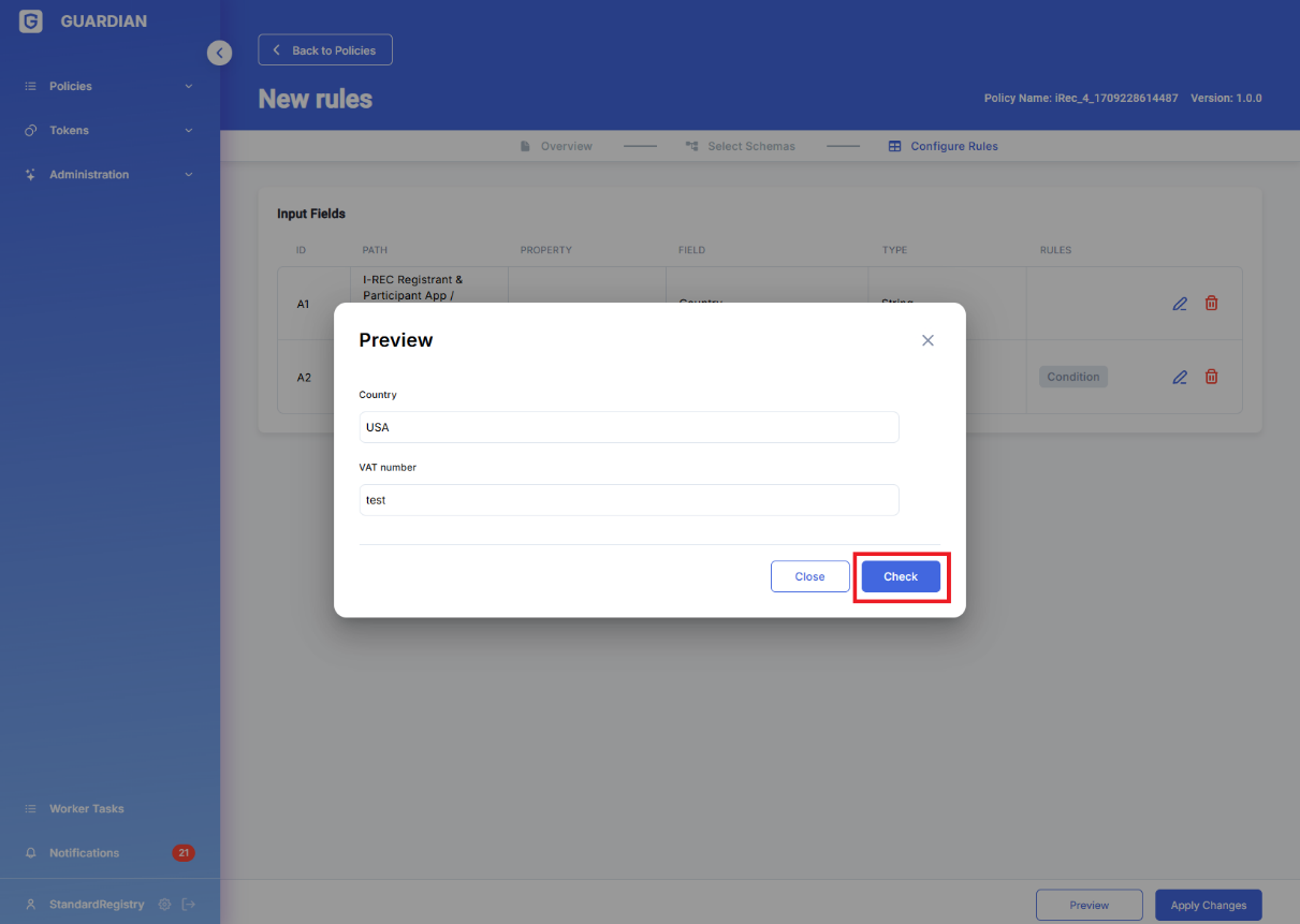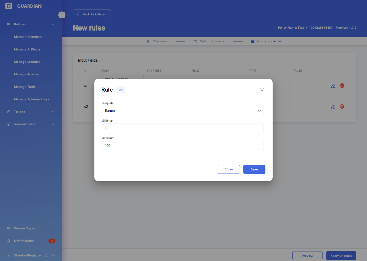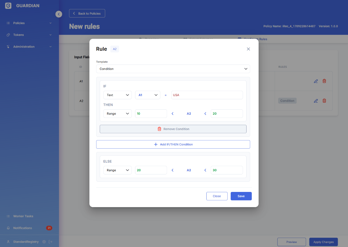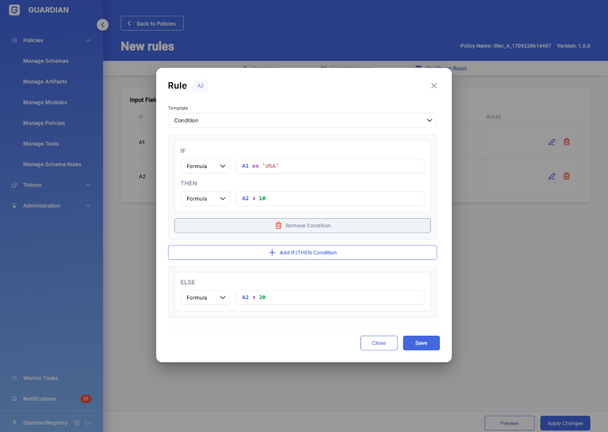Schema rules have been created to enable authorised policy users to offer assistance to other users (and/or themselves) with data input and/or data evaluation. Schema rules define acceptable values and their ranges for schema fields (and correspondingly input fields in Guardian forms). They are activated in the UI whenever the form is viewed by users, and re-evaluated every time any of the values on the form is changed. Rules can contain mathematical formulas and logical if-then-else flow, and source data from any field in the current schema as well as any other schemas/documents that are present in the corresponding policy. When rules are evaluated they produce a binary βpass/failβ output, which is displayed in the UI as green and amber field highlights correspondingly.