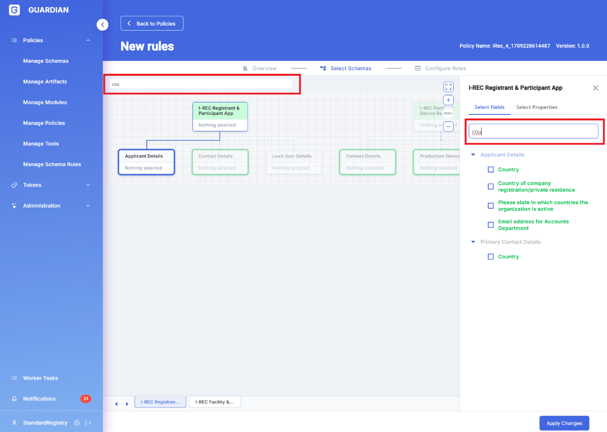 In complex policies the complexity of schema structures can be difficult to navigate, rules creators could use search tool to optimize their work.