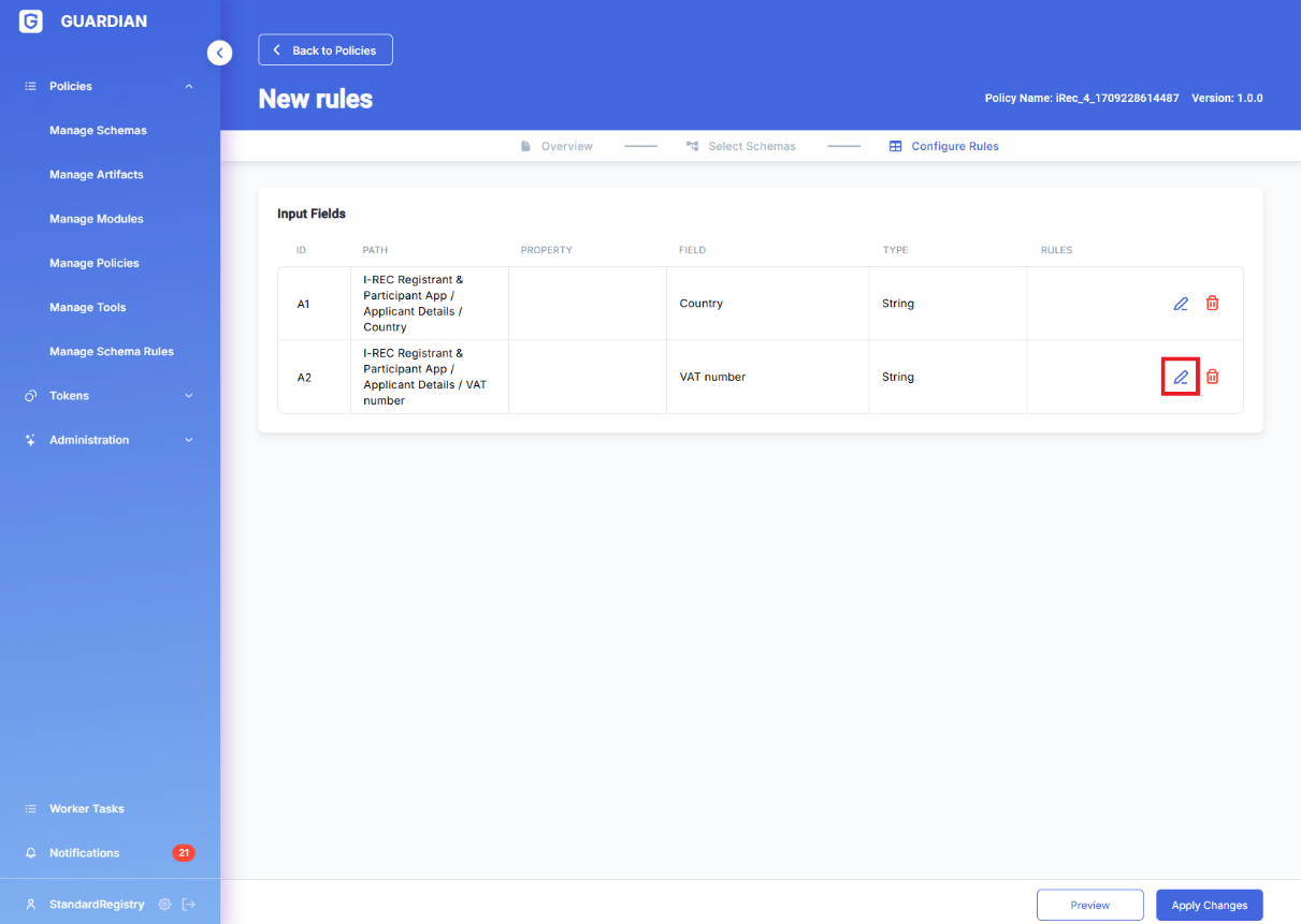 After a rule has been created it should be configured to be meaningful, the process can be started by clicking the edit icon in the rules grid.